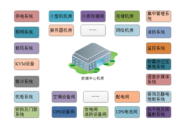 數據中心機房(DataCenter)是一個傳遞、加速、展示、計算、存儲數據信息的多功能(néng)物理空間,由多種(zhǒng)系統和設備組成(chéng),如供電、照明系統、新風系統、制冷系統、機櫃系統、KVM設備集中管理系統、消防系統、監控系統、抗幹擾及防輻射系統、防雷放過(guò)壓接地系統、語音多媒體系統、安防及門禁系統、裝飾及靜電地闆系統等;及組成(chéng)這(zhè)些系統的專業設備如計算機設備、服務器設備、網絡設備、存儲設備等網絡核心機房的關鍵設備。